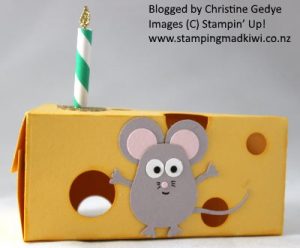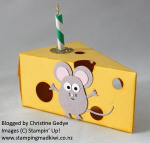 The ‘cheese’ is cut from Daffodil Delight cardstock using the Cutie Pie Thinlits, with holes randomly punched using a variety of circle punches, then sponged with Daffodil Delight ink around the edges of the cheese and the holes.
