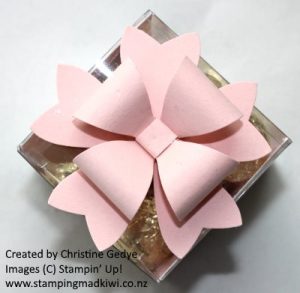 In this instance, I have cut a piece of DSP (Designer Series Paper) 15 x 5cm, scored at 5 and 10cms, popped inside the treat box, filled with treats and then topped with a bow made using the Bow Builder Punch.